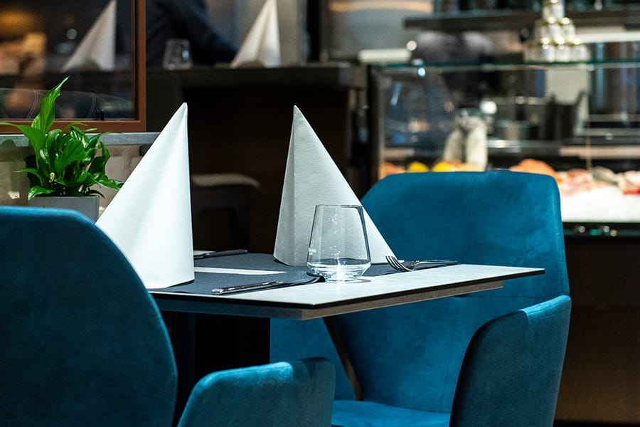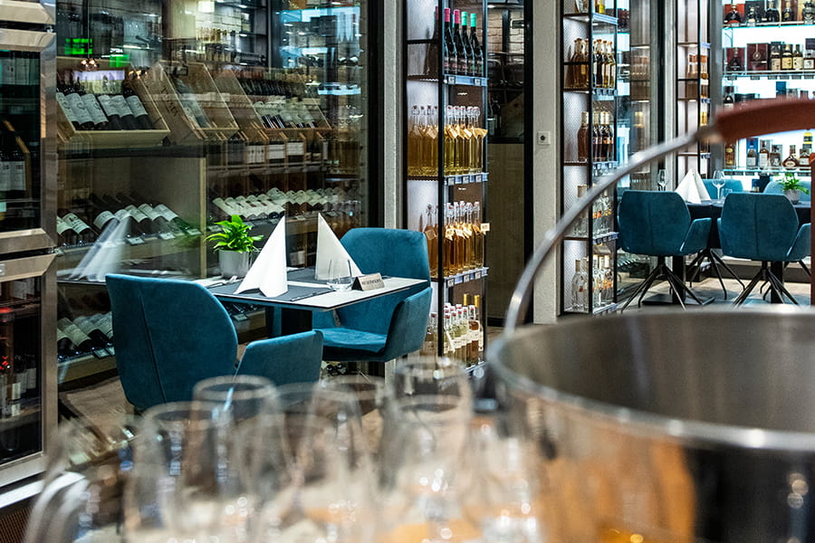 Ein besonderer Blickfang zudem das temperierte Weingewölbe, in dem ausgesuchte Raritäten optimal gelagert werden. Durch eine Glasscheibe einsehbar, lädt es zum Staunen ein und unterstreicht den hohen Anspruch an Qualität und Reife. Ergänzt wird die Weinwelt durch eine beeindruckende Spirituosenwand: In der großen Vitrine präsentieren sich erlesene Whiskys, feine Rums, charaktervolle Gins und edle Brände etc. aus aller Welt.